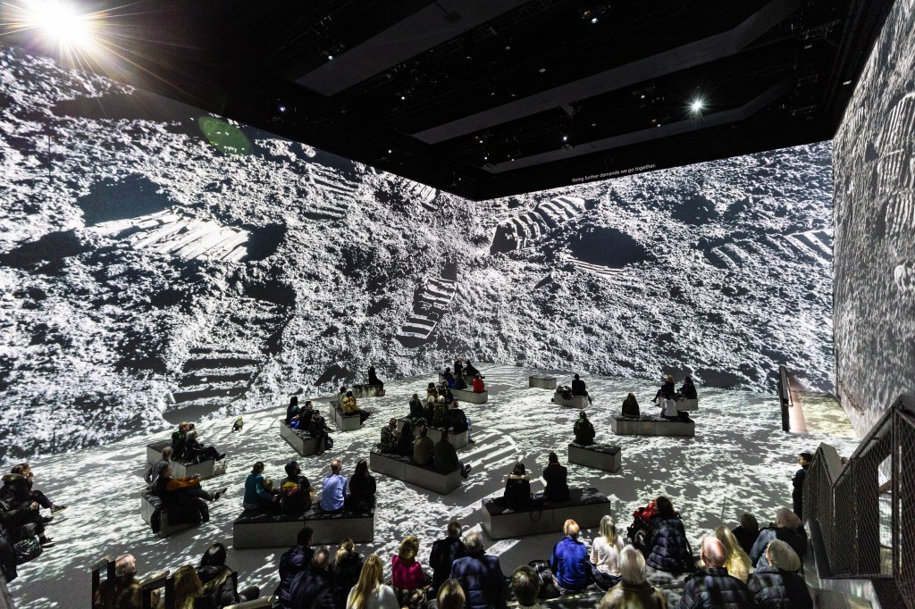 The visuals and music are where this show truly lifts off. The original score by Anne Nikitin, performed by the Royal Philharmonic Orchestra and conducted by Tom Kelly, is cinematic in the best way. The rocket launch sequence is breathtaking, both visually and sonically. Major credit to Tom Hackley’s sound design, which somehow makes you feel like you’re there on the launchpad. The footage, all real and remastered from NASA archives, spans the full moon mission timeline and is projected floor-to-ceiling across the space. It’s awe-inspiring without being overwhelming, and it gives you the sense of being both a witness and a participant to the first mission to the moon.