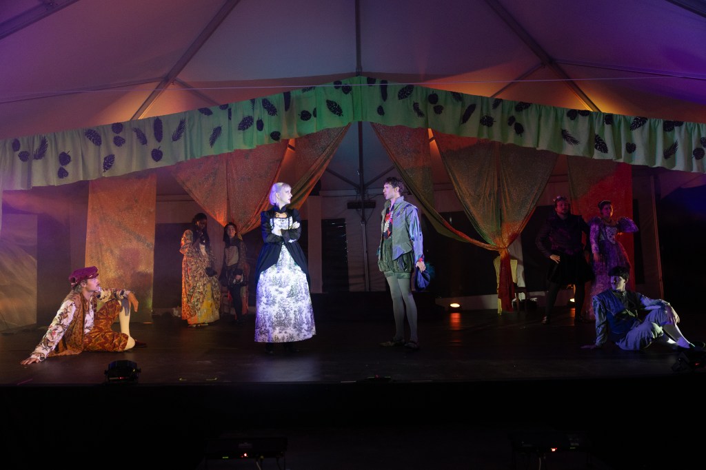 In smaller roles, several performers still left a big impression. Nate Oaks as Longaville had built every joke and delivered every punchline like a pro, and his dancing in Act Two was laugh-out-loud funny. Stuart Siegel offered a steady, grounding presence to the show. His delivery helped bridge some of the more confusing plot points, and those moments of clarity were appreciated. For audiences less familiar with Shakespeare, his performance served as a quiet guide, helping us stay on track without ever pulling focus.