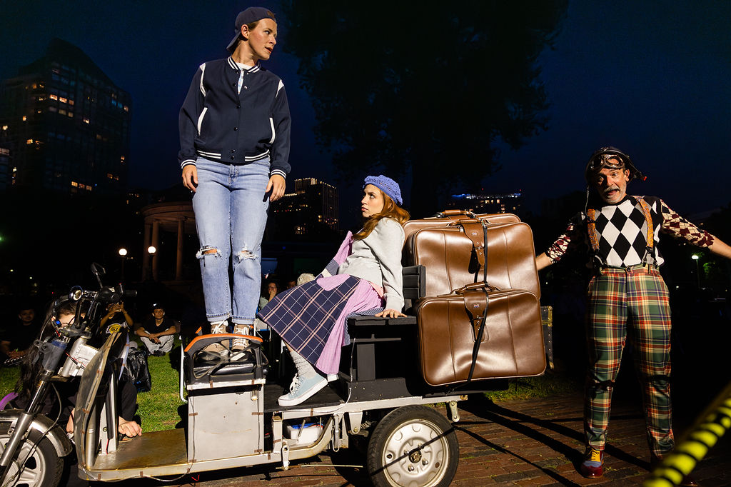 Directed by Steven Maler, CSC’s As You Like It transforms Boston Common into a forest buzzing with music, romance, and quick-footed comedy. The production is a lively mix of physical humor, sharp timing, and moments of tenderness, all while leaning into the joy and chaos of Shakespeare’s pastoral world. This staging keeps the energy high—sometimes literally, with actors racing up and down stair ladders—and delivers a show that’s equal parts charm and craft.