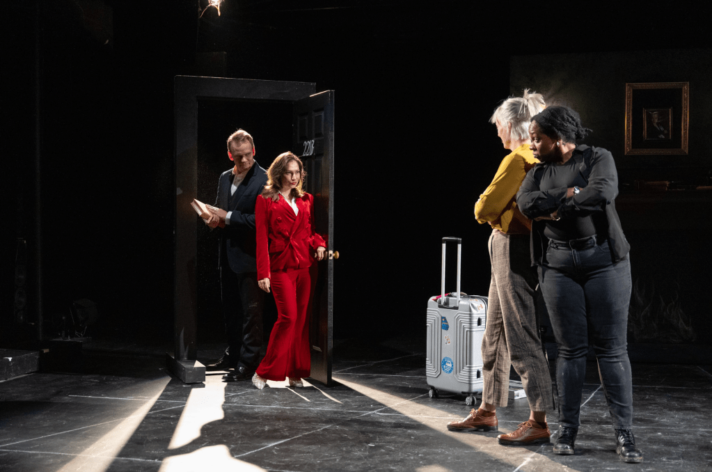 Deb Sullivan’s lighting and Julian Crocamo’s sound design were key in creating the play’s signature vibe. From the sharp snap of a cue to the subtle underscoring of tension, they gave the piece that noir-inspired, old-school detective feel in an incredibly modern way. Those choices helped smooth over some of the tonal shifts and carried the audience through the show’s more exaggerated moments. Chelsea Kerl’s costumes deserve a mention for how much they added to the characters themselves, Holmes’s sharp lines and Adler’s striking elegance and red pantsuit gave instant insight into who these people are before they even spoke. The chalkboard floor was another highlight, doubling as both set and storytelling tool. Watching the actors sketch out little details brought a playful layer to the staging, almost like peeking into the detectives’ notebooks in real time. These design elements gave the production a sense of cohesion and made it feel more dynamic.